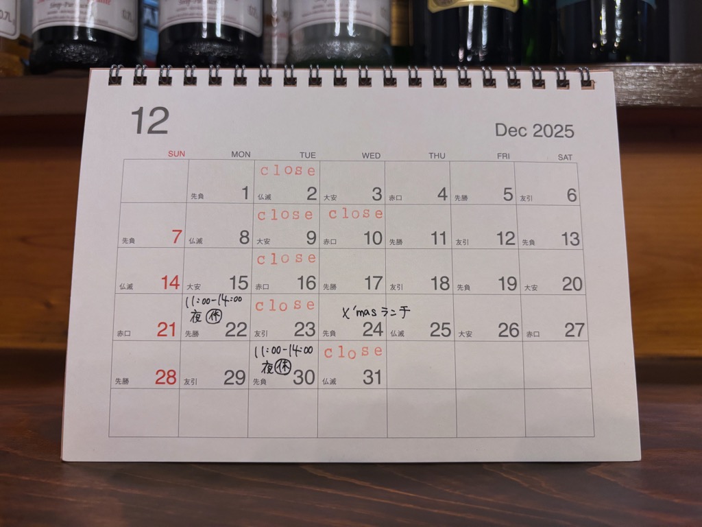 仕入れ状況や仕込みの加減で営業時間を変更させて頂く日もあるかもしれませんが、ご理解の程よろしくお願い致します。